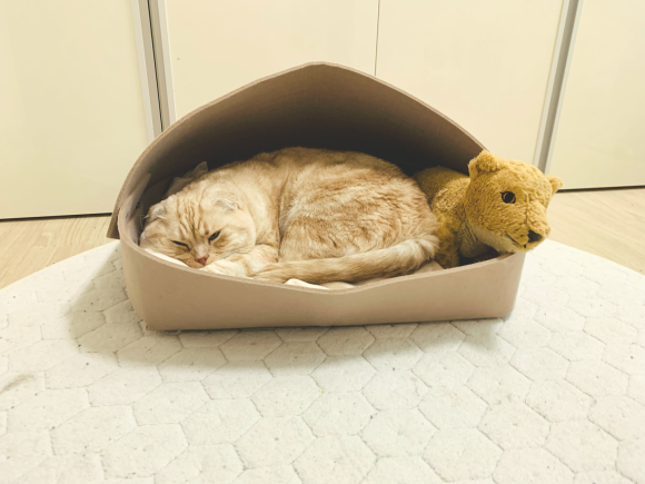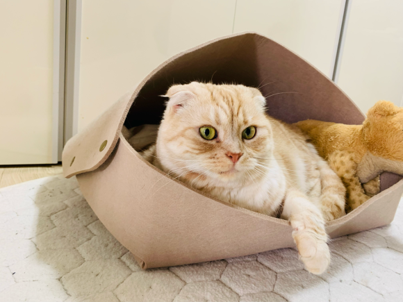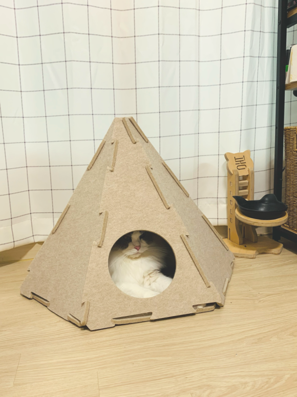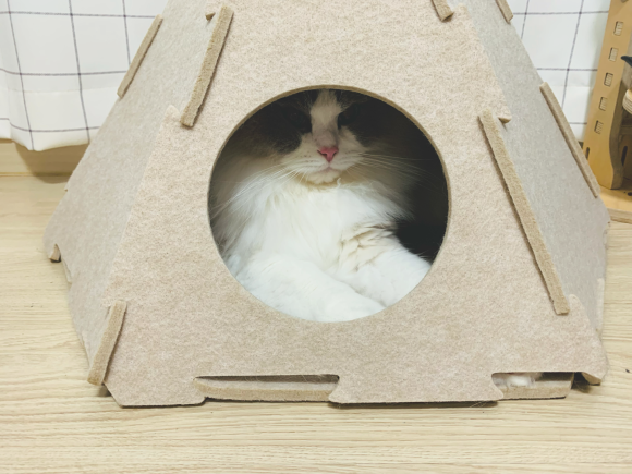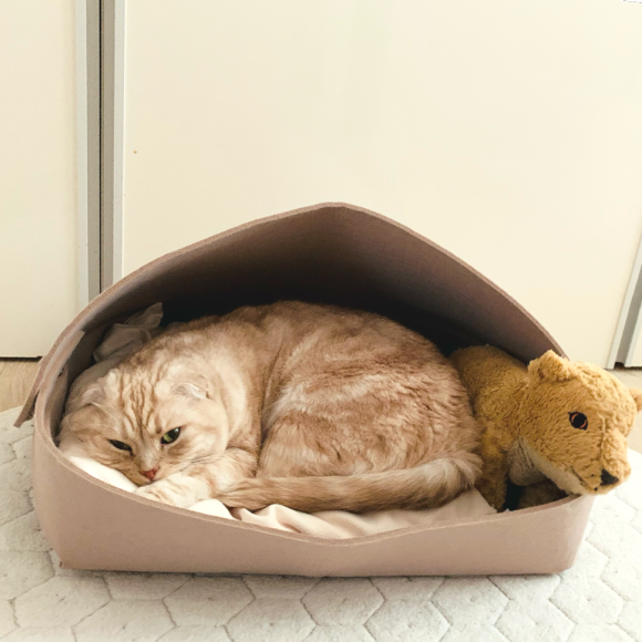 연이의 픽은 러블리 무지개요람! 요람은 봉연리 모두에게 인기가 있었어요! 포근한 극세사 재질에, 몸을 기댈 수 있는 앞막이가 있어서 냥이들이 특히 좋아하는 거 같아요. ㅎㅎ 3. 리의 삼각 펠트 숨숨집