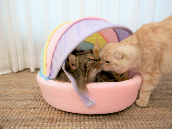 봉이의 최애픽은 심플 캣후드! 후드형의 하우스라서 냥이가 안정감을 느낄 수 있어요♥ 옵션으로 함께 있는 솜솜쿠션은 냥이의 몸을 포근하게 감싸줍니다 :) 2. 연이의 러블리 무지개요람